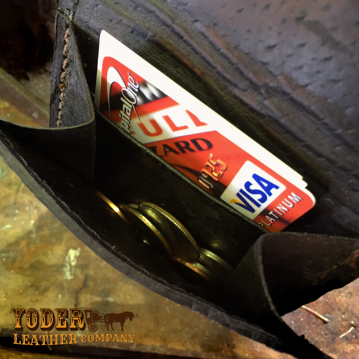 This taxicab style wallet has two large separated money pockets on the inside that snap closed. The flip side has a coin pouch for your change and a pocket for 3 to 4 credit cards or similar sized items.