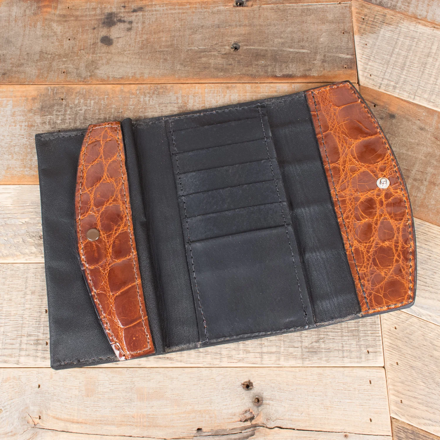 This clutch is made with beautiful Florida cognac brown alligator leather. It is stitched with heavy duty nylon thread that accents the color of the leather. It has 6 credit card slots. There is also space behind the credit card slots to store paper cash. The other side is a coin pocket with snap that also has a pocket behind it.