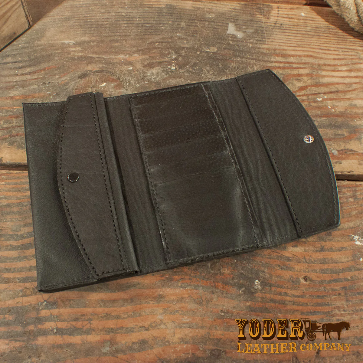 This clutch is made with beautiful premium top grain black bison. Bison is sometimes referred to as American buffalo. It is stitched with heavy duty nylon thread that accents the color of the leather. It has 6 credit card slots. There is also space behind the credit card slots to store paper cash. The other side is a coin pocket with snap that also has a pocket behind it.