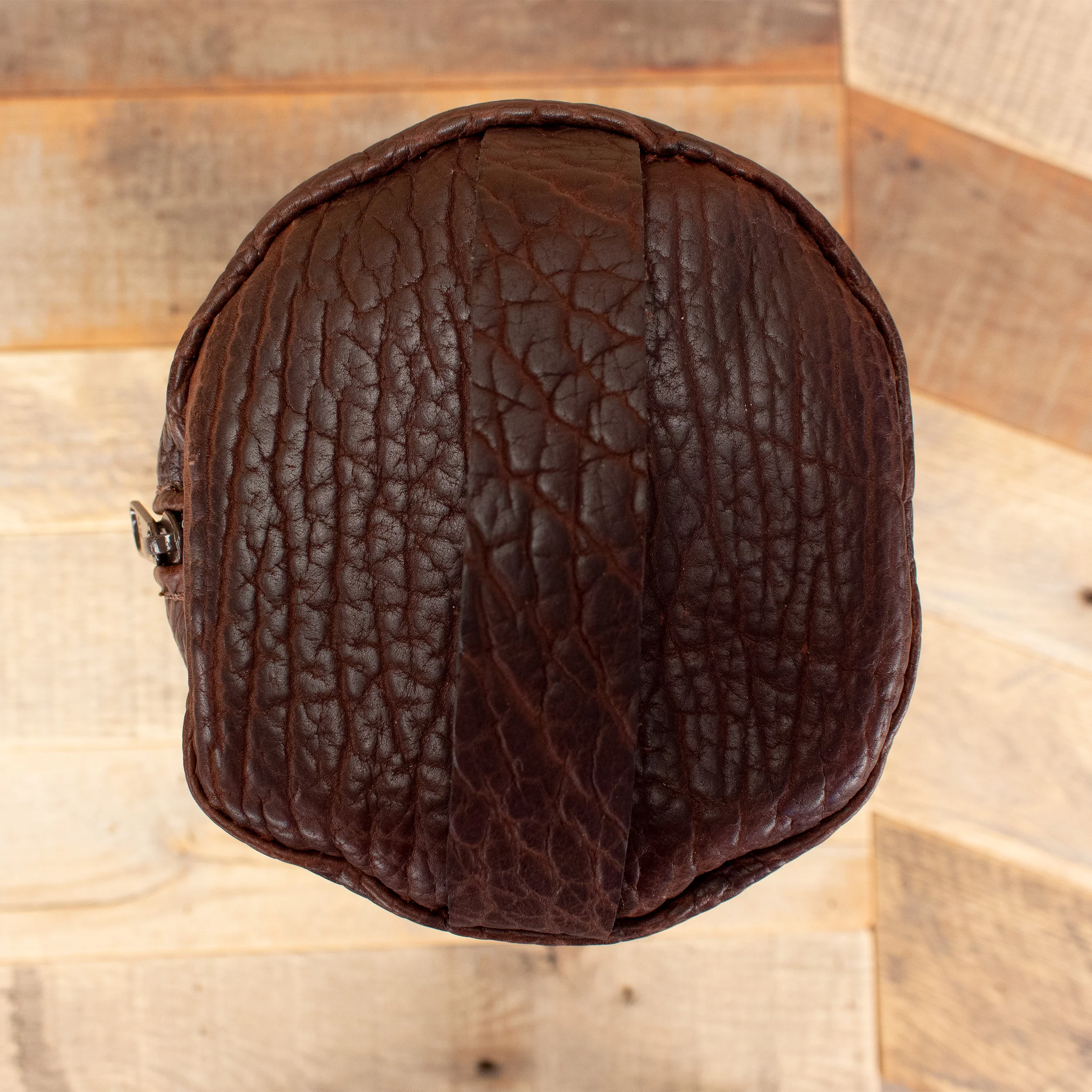 Travel in style with our Genuine Shrunken Bison Leather Toiletry Bag. It is stitched with heavy duty nylon thread that matches the color of the leather. The tubular design takes up less space in your suitcase but the wide opening with no jam zipper allows room for plenty of your toiletry kit essentials.