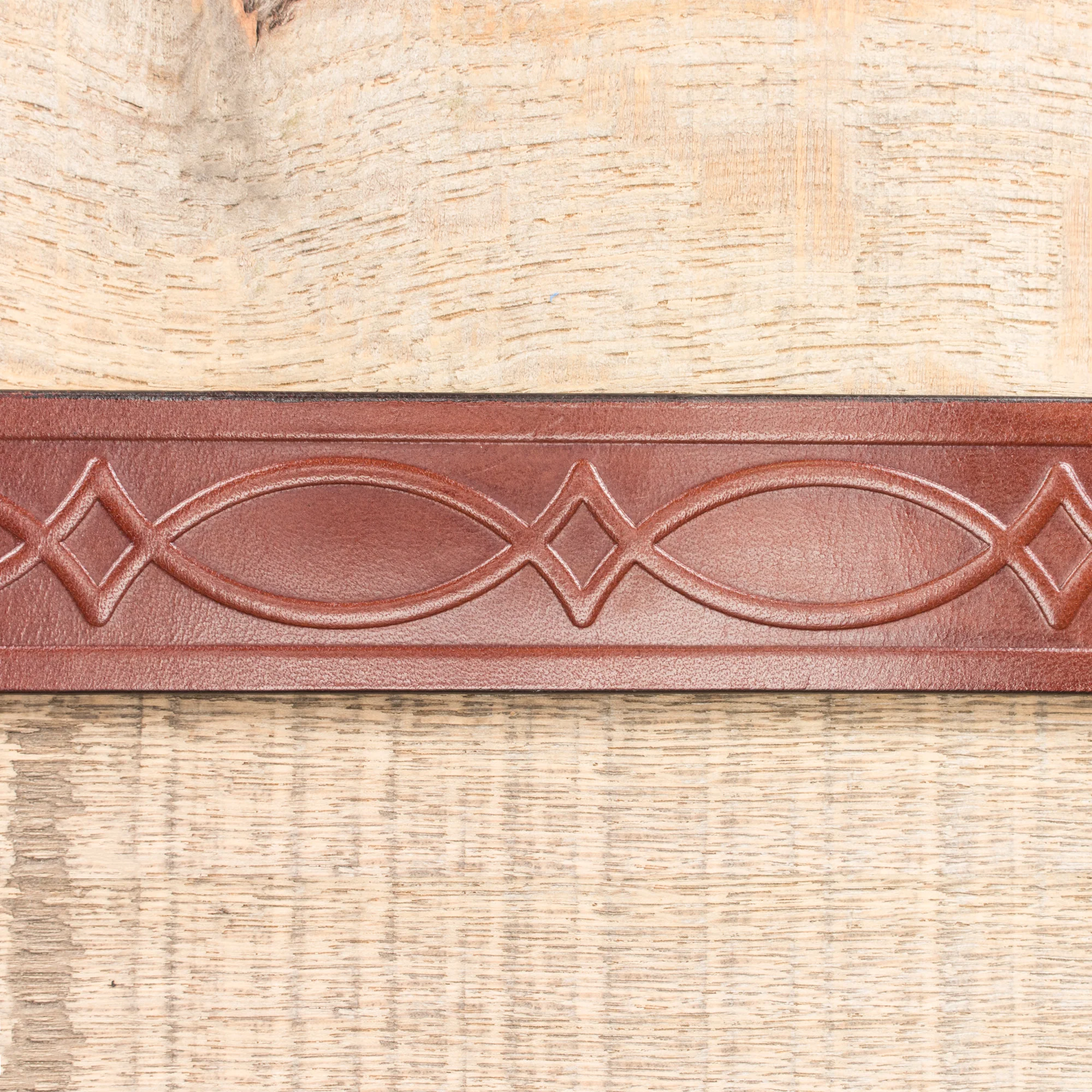 This English Bridle leather isn't your ordinary leather. It's thick and hearty. It's stronger and thicker than anything you'll find in a department store. This particular belt has an embossed classic kent pattern pressed deeply into the leather.