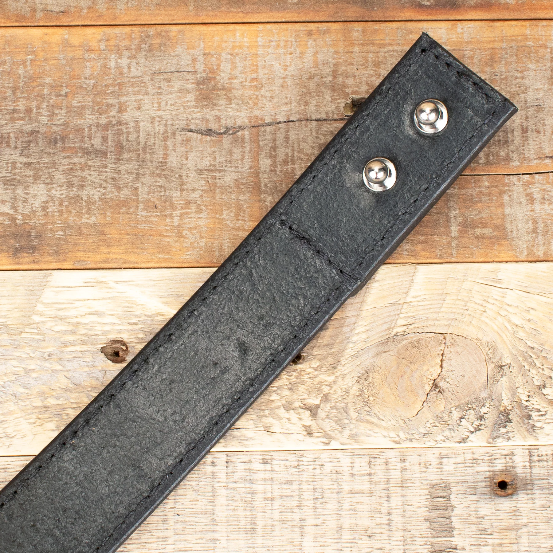 This belt is 1.5" wide and made from thick American made leather. Comes with 7 large oval holes spaced 1 inch apart. This isn't glued or bonded like cheap Chinese imports and will never separate.