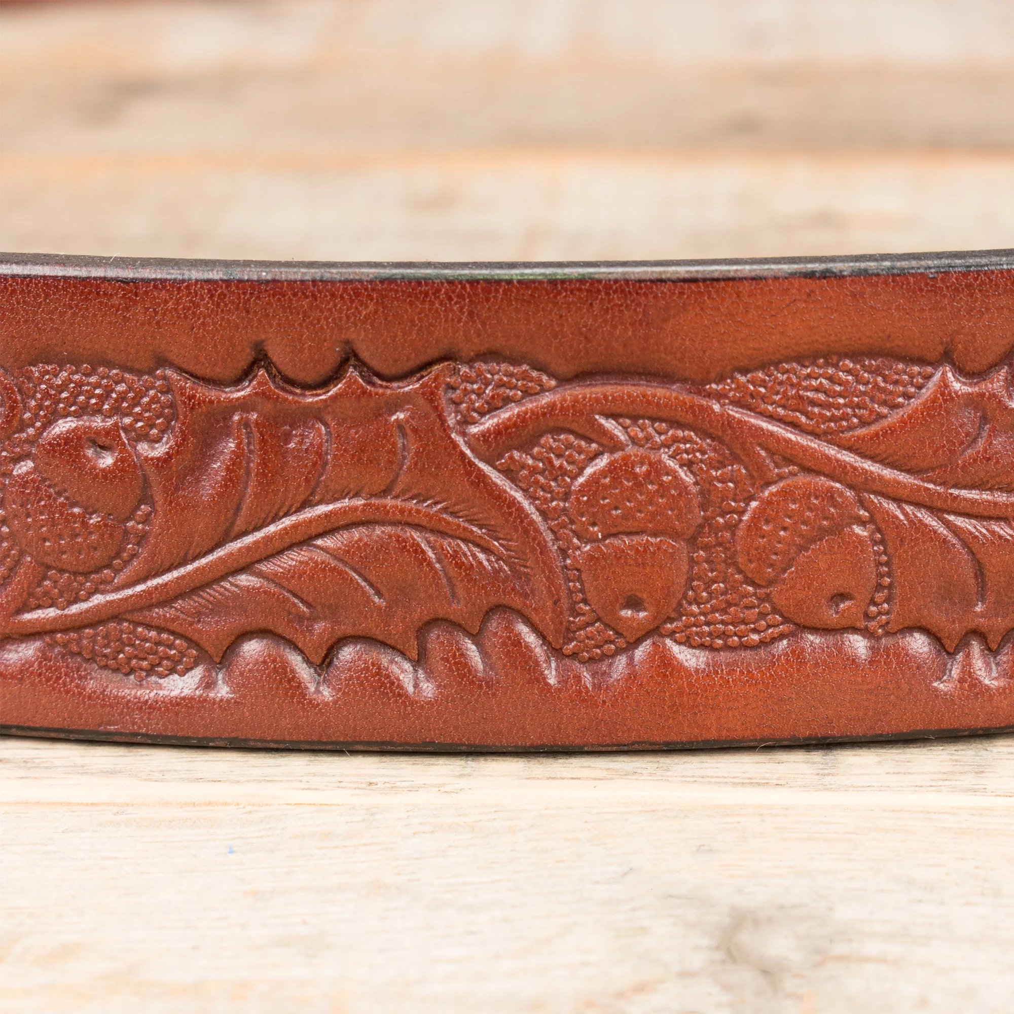 This English Bridle leather isn't your ordinary leather. It's thick and hearty. It's stronger and thicker than anything you'll find in a department store. This particular belt has an embossed oak leaf pattern pressed deeply into the leather.