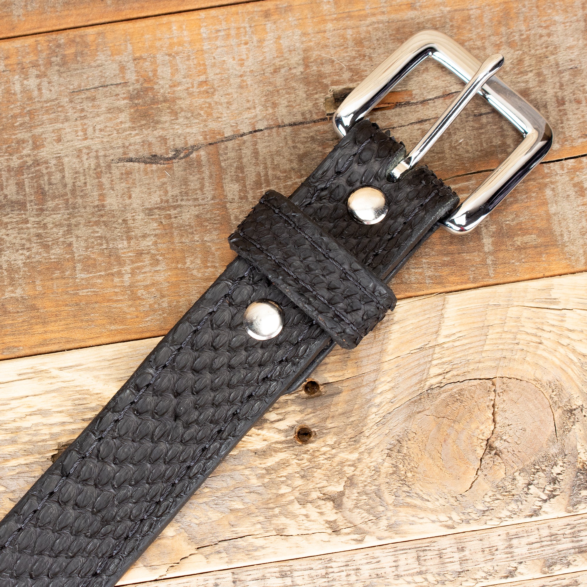 This snake belt is backed with a layer of high grade black cowhide to give it added stability. It is finished with heavy nylon stitched around the edge.