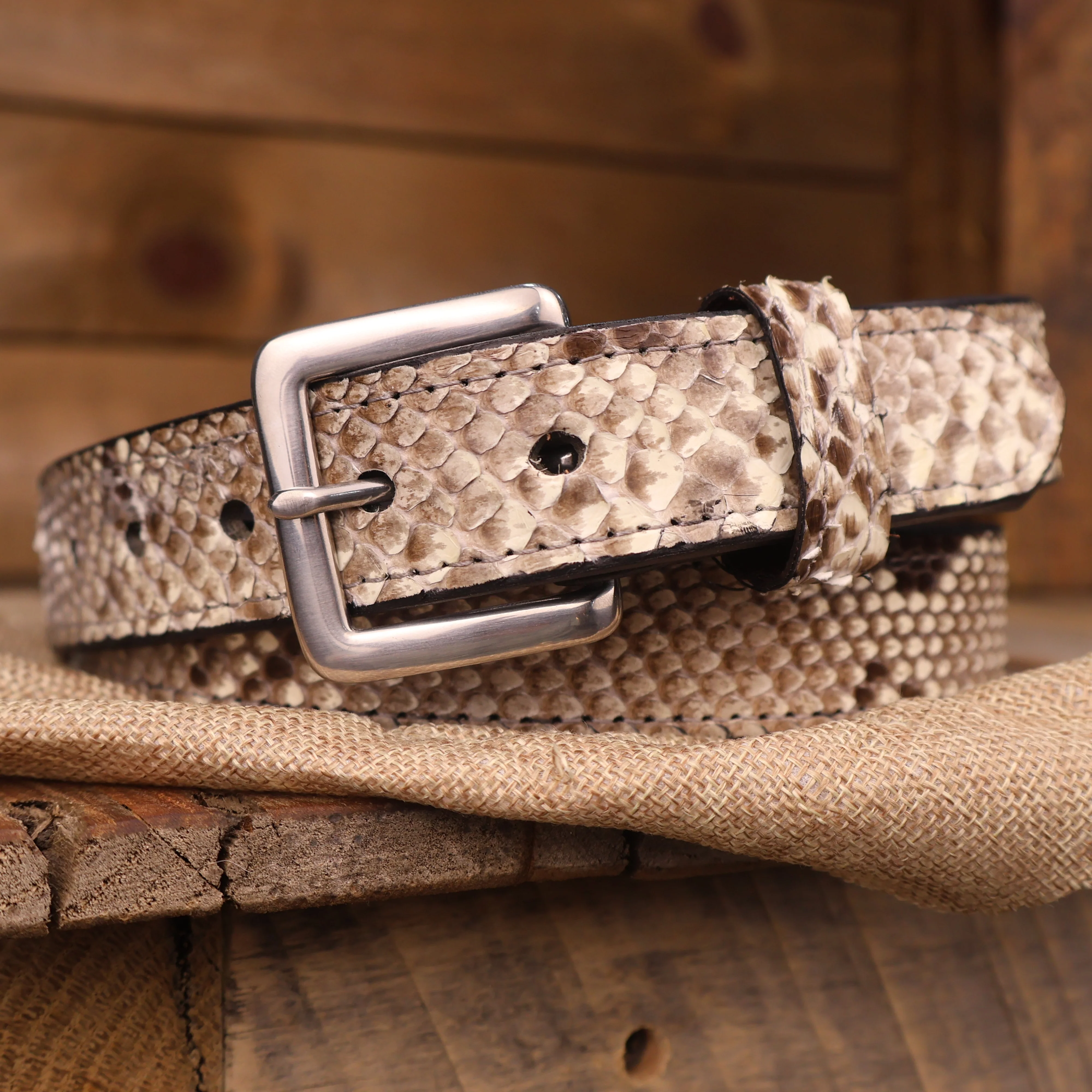 This belt is made from premium python snake leather. Comes with 7 holes spaced 1 inch apart. It comes with a beautiful square chrome over solid brass buckle.